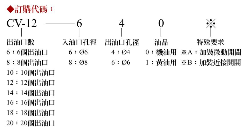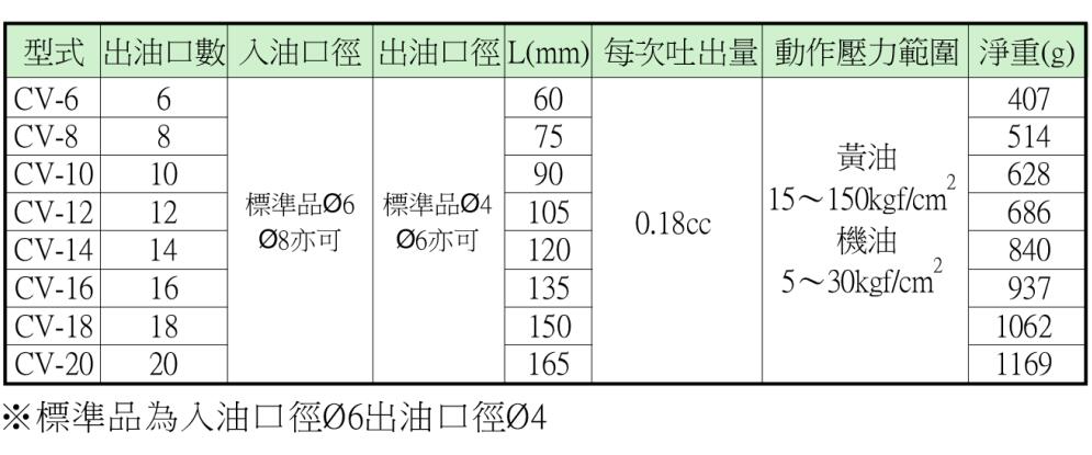 產(chǎn)品特點(diǎn) / Characteristics 性能與特點(diǎn) 1、CV型單一循環(huán)分配器榮獲臺(tái)灣新型專利第182121號(hào)。 2、特點(diǎn)是「油量固定」,亦即每個(gè)潤滑點(diǎn)可獲得同樣的潤滑油量,CV型每次循環(huán)每一孔之吐出量