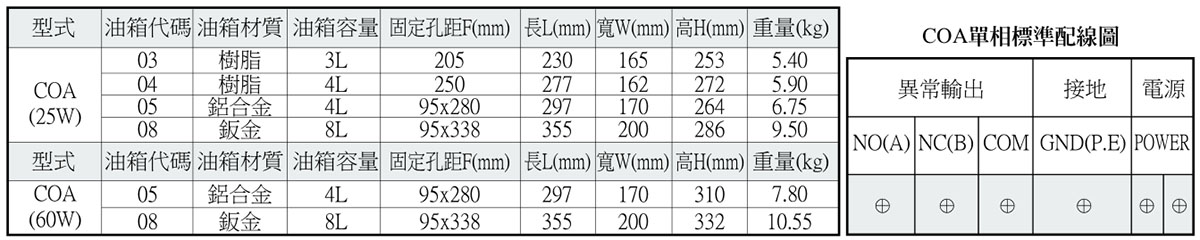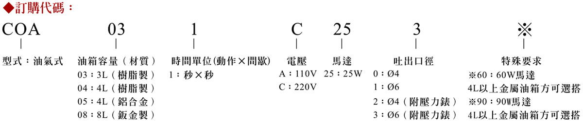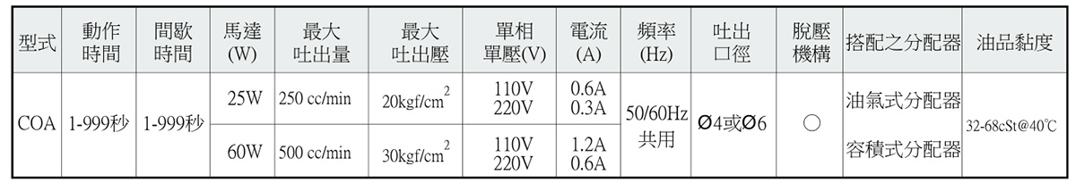 2.CO、OA型油氣容積式分配器特點是「油量固定」,亦即每個潤滑點可獲得同樣的潤滑油量,CO型風(fēng)量固定,OA型則可調(diào)整風(fēng)量