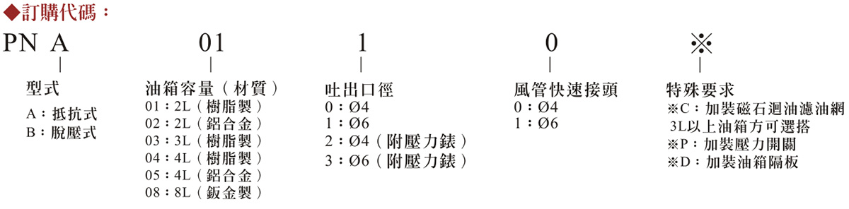 PNA、PNB型氣動(dòng)式注油機(jī)流量較小,適用于需要較小流量之機(jī)械設(shè)備,一般常用于編織機(jī)、鈑金機(jī)械等